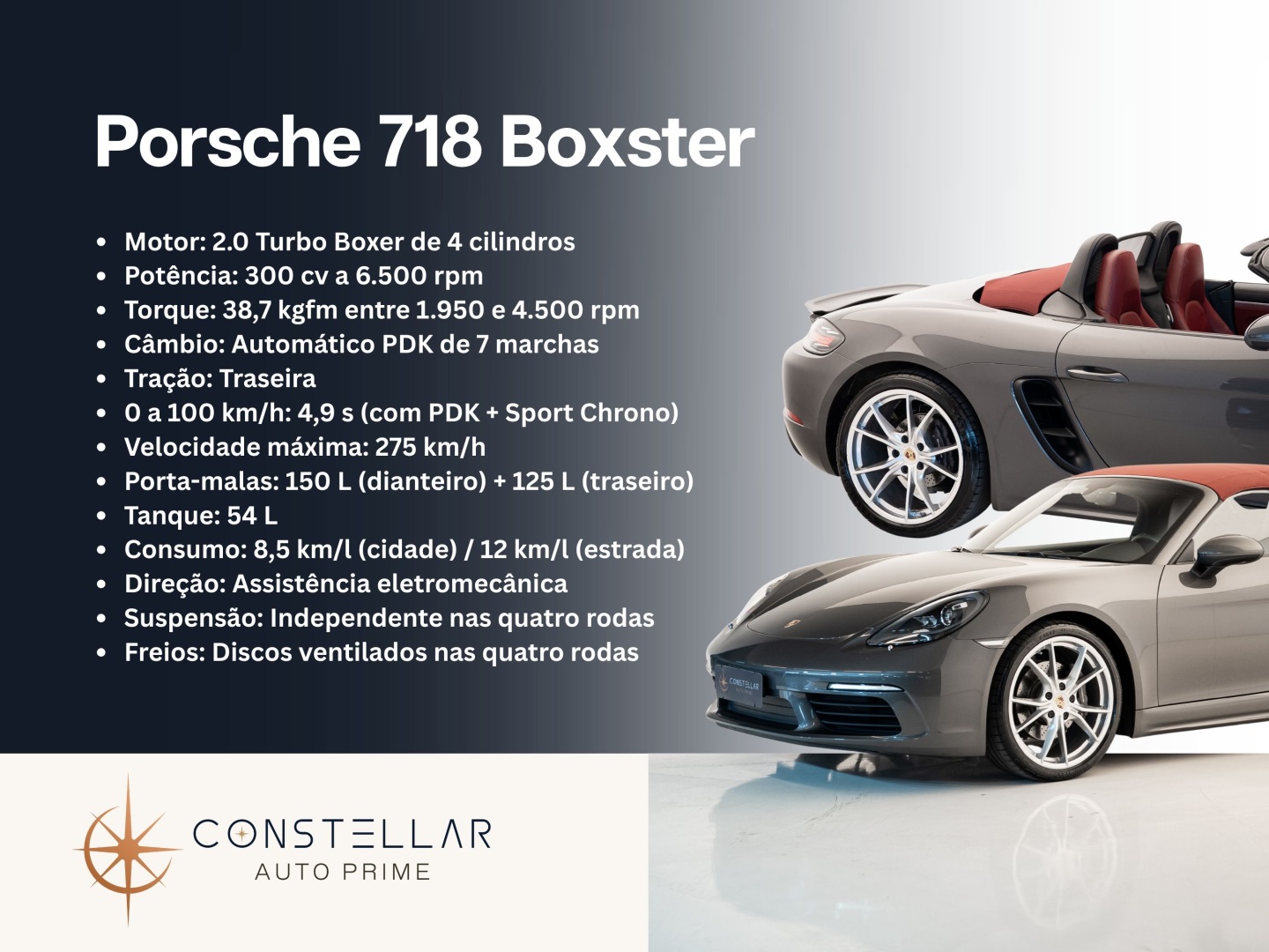 Porsche 718 Boxster, na cor cinza ágata com interior bordeaux.Veículo revisado na concessionária, sem retoque de pintura e com laudo cautelar aprovado.Uma das combinações de cores mais elegantes da linha, oferecendo um excelente custo-benefício e entregando muito em performance, estilo e experiência de condução.